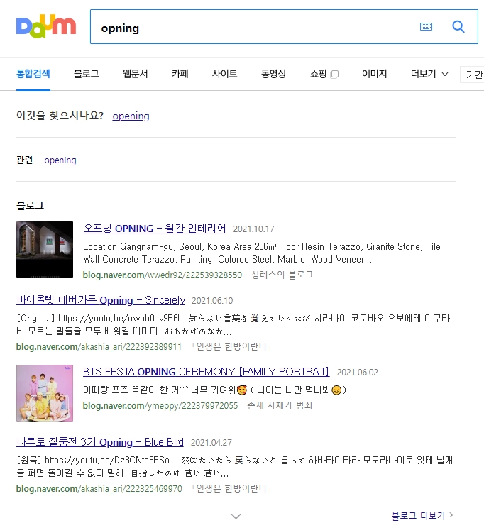 다음 검색창에서 본인의 티스토리 블로그 주소를 입력 후 검색을 클릭해서 사이트로 보인다면 다음 최적화가 완료된 것입니다.
